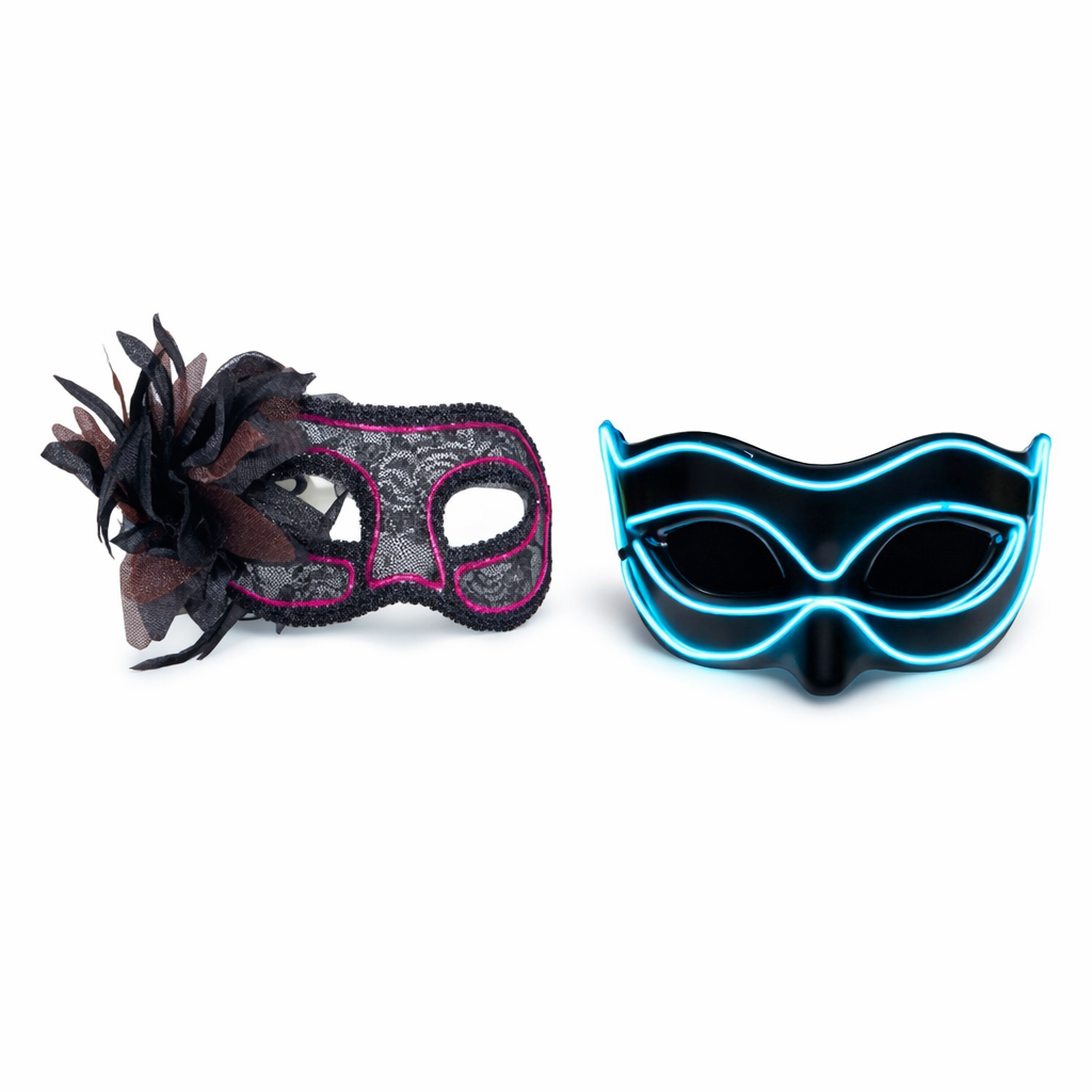 Antifaz luminoso, tipo de luz LED. Funciona con dos pilas AA (no incluidas). Tres secuencias de luz, las cuales se cambian con solo apretar un botón. Caja para pilas plástica. Cables recubiertos de plástico. Con cinta símil raso para atar.