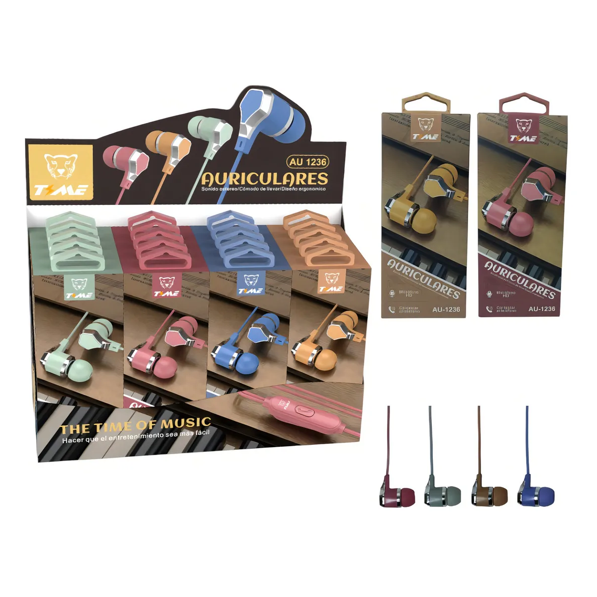 Auriculares Time formato in ear. Con micrófono y conexión Jack de 3,5 mm. Varios colores con exhibidor.