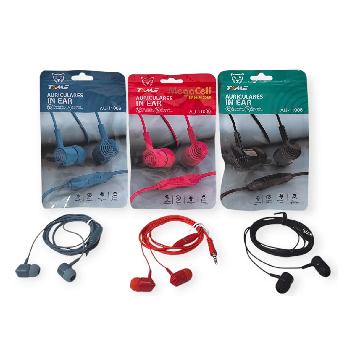 Auriculares Time formato in ear con micrófono y conexión Jack 3.5 mm. Vienen en bolsas individuales con colores varios.