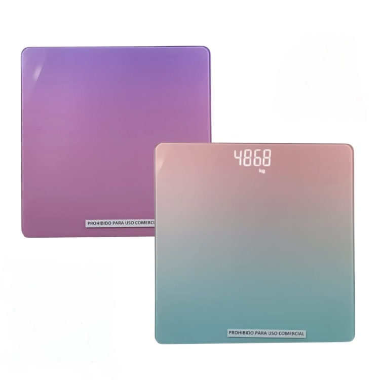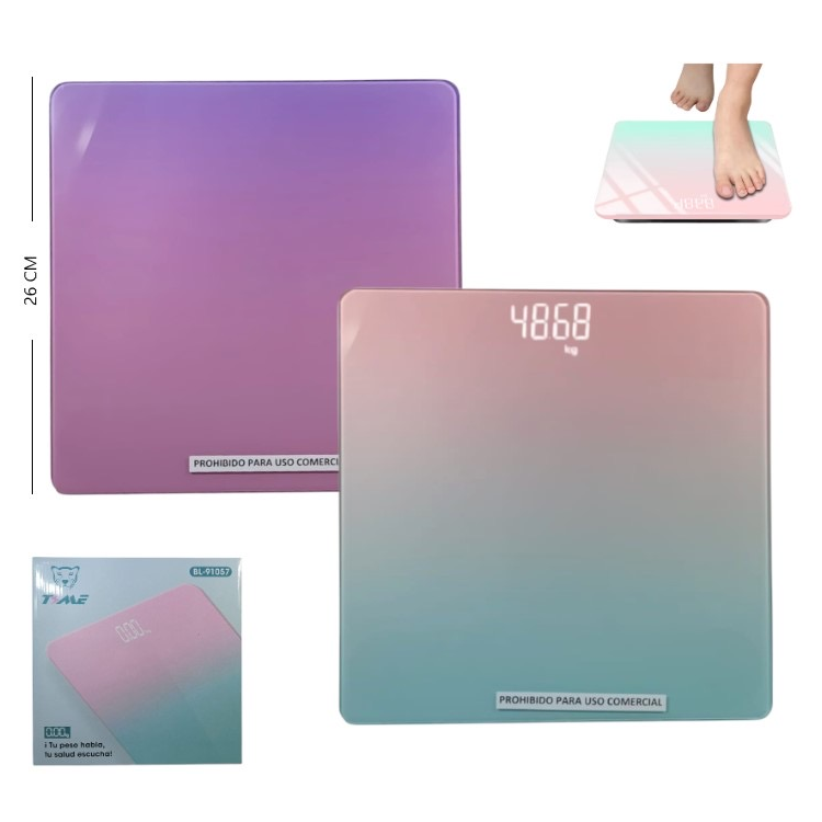 Báscula digital con una capacidad máxima de 180 kg. La plataforma es de vidrio. Apagado automático. Medida: 26x26 cm y 1 cm de alto.