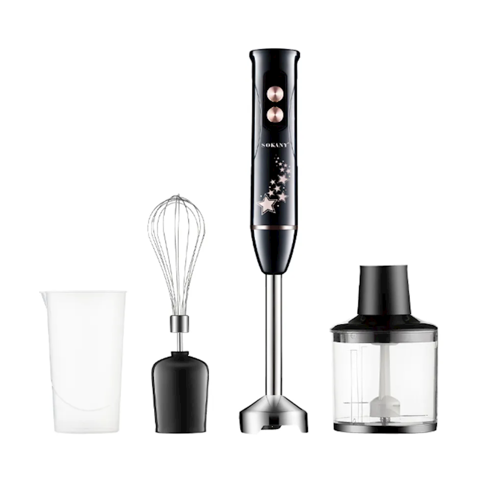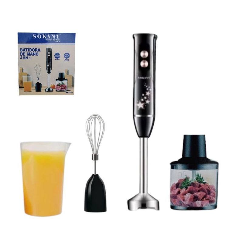 Minipimer mixer. Batidora de inmersión. Cuenta con dos velocidades. Varilla y hoja de acero inoxidable. Frecuencia: 50/60 Hz. Potencia: 800w. Voltaje: 220v. Incluye accesorios. Marca: Sokany.