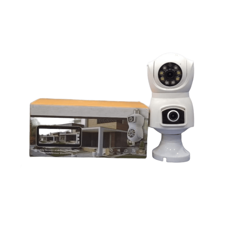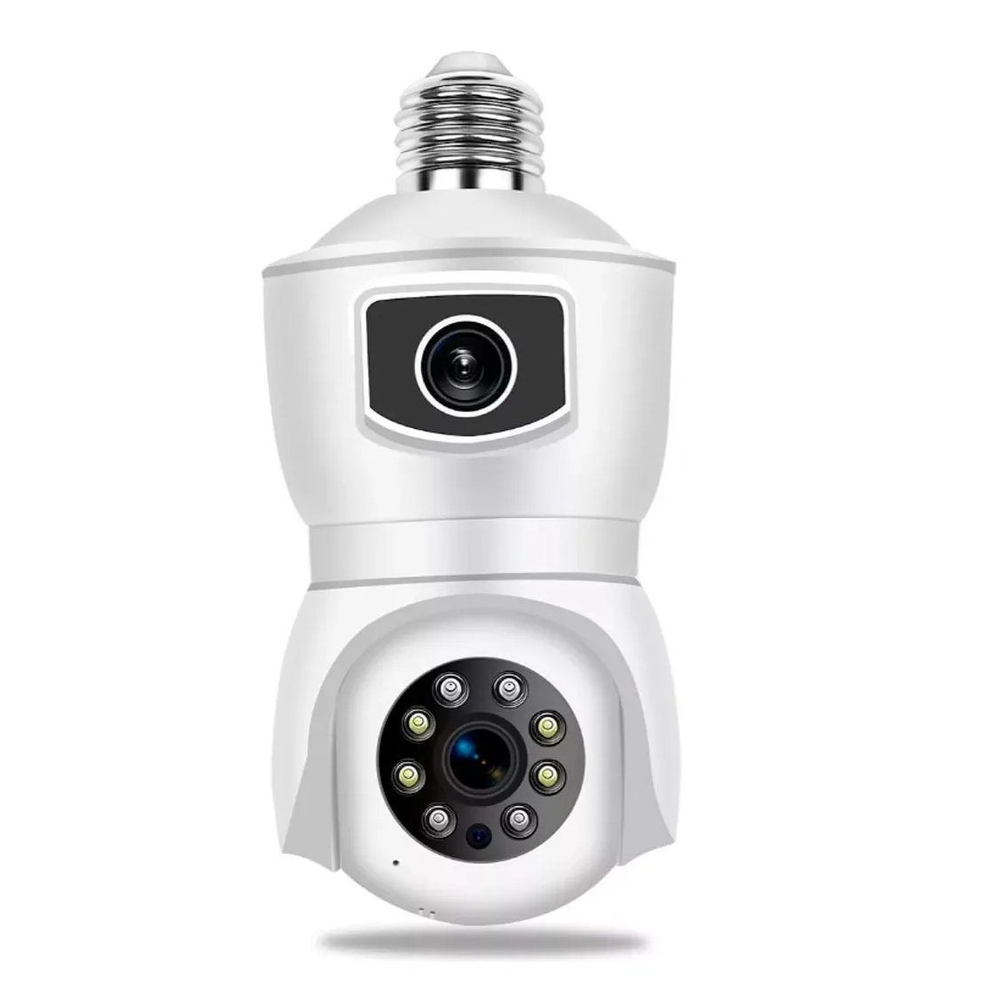 Cámara de seguridad tipo foco, para conectar a un casquillo de luz de E27. Configuración Wifi de 2,4 GHz. Resolución full HD 1080p. Diseño de doble lente, con mira a dos direcciones en simultáneo. La lente de la cámara permite cubrir un monitoreo de 355° al mismo tiempo. Cuenta con detección y seguimiento de movimiento, alarma de audio y luz, y reflectores.