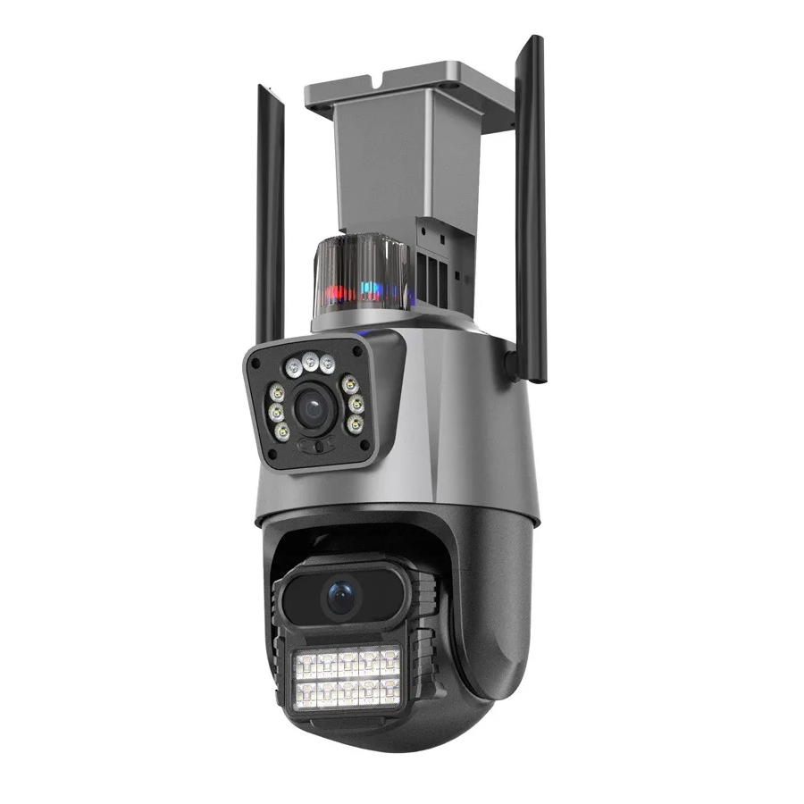 Cámara PTZ IP inalámbrica con doble lente, apta para exterior. Calidad de resolución de la cámara: 6mp. Lentes de 3.6mm incorporados. Zoom 4x. Permite una rotación de 355° de izquierda a derecha y 90° de arriba hacia abajo. Cuenta con visión nocturna. Luces LED. Aplicación compatible con Android o dispositivos iOS.