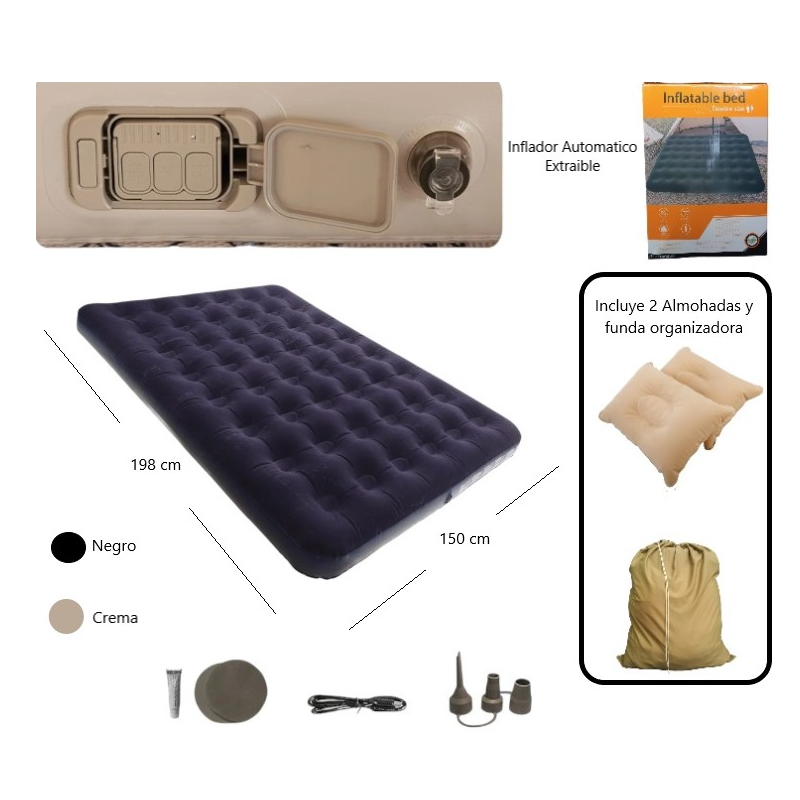 Colchón inflable de dos cuerpos. Cuenta con una bomba incorporada recargable que se infla en solo minutos ofreciendo un montaje rápido. Material: PVC multicapa a prueba de pinchazos. Incluye dos almohadones y una bolsa de almacenamiento que facilita su transporte.