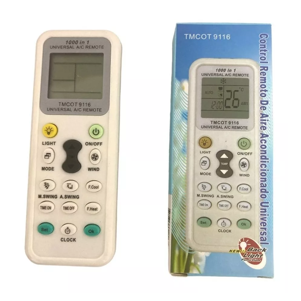 Control remoto universal de aire acondicionado, sirve para frío y calor. Funciona con dos pilas AAA (no incluidas).