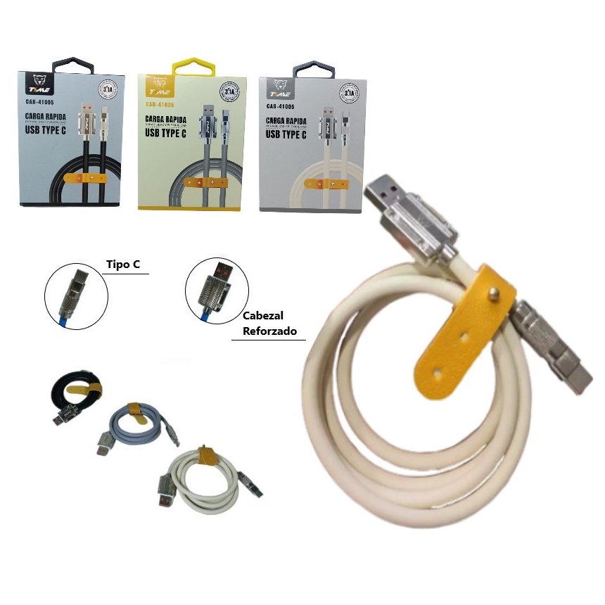 Cable con entrada USB y salida tipo C. Con una longitud de 1 metro. Cuenta con punta reforzada de metal. Varios colores.