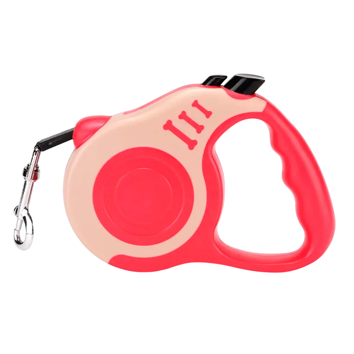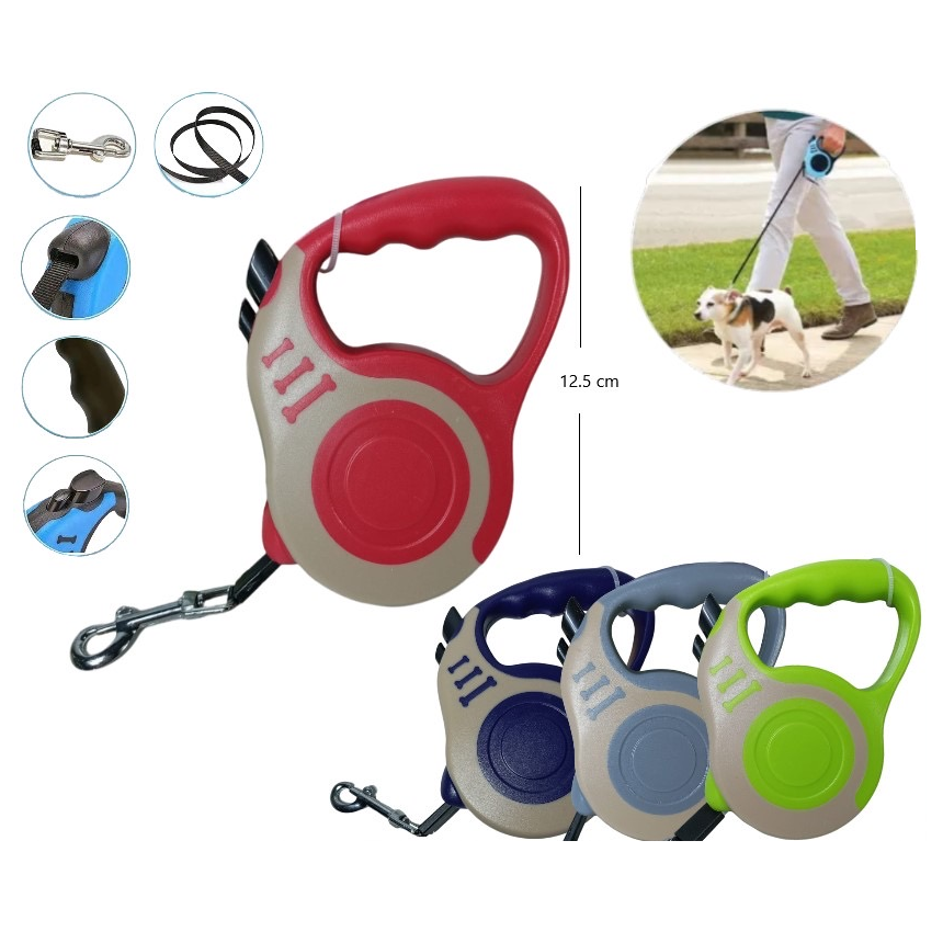 Correa para perro extensible hasta 3 metros. Peso máximo soportado 30 kilos. Función retráctil. Cuenta con botón de freno. Incluye gancho metálico. En varios colores.