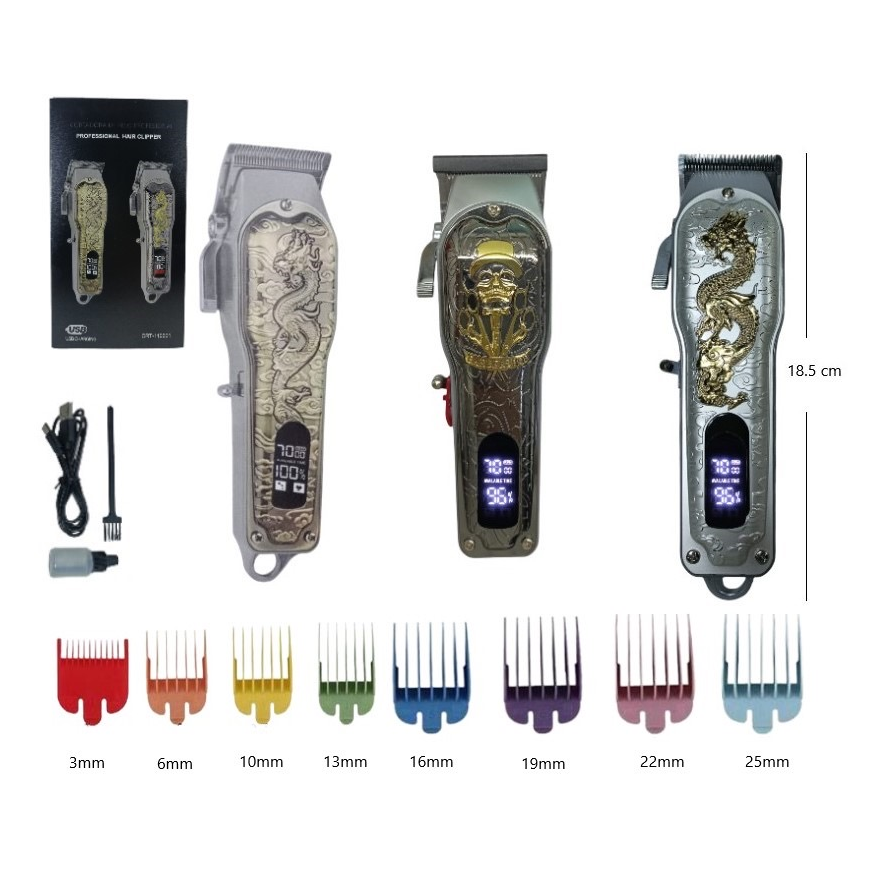 Máquina de cortar pelo inalámbrica con pantalla LCD. Trae 8 peines. Función adicional: afeitadora. Recargable por medio de USB (cable incluido). Varios diseños.