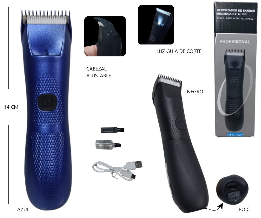 Corta pelo recargable USB Tipo C con cuchillas de acero inoxidable, cabezal ajustable y luz guía para cortes precisos. Compacta, portátil y rápida, incluye cable, aceite y cepillo. Disponible en negro y azul.