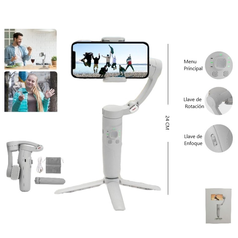 Estabilizador antivibración de tres ejes con seguimiento facial y seguimiento automático para selfies. Garantiza que permanezca enfocado mientras toma selfies o graba escenas dinámicas. Diseño ligero y ergonómico. Con controles intuitivos y una batería de larga duración. Cuenta con conectividad bluetooth. Luz LED. Incluye cable USB para recargar.