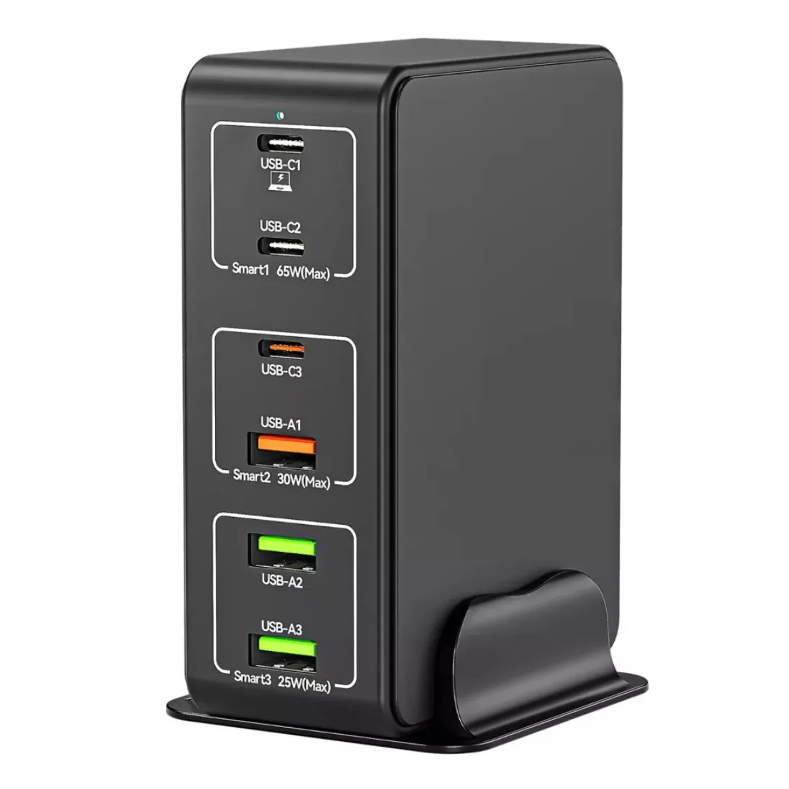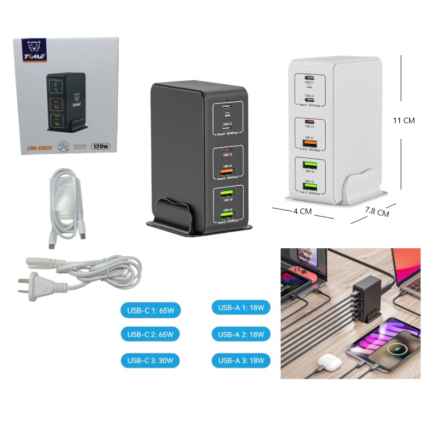 Cargador múltiple con 6 puertos. Tipos de conectores: 3 USB A y 3 USB C. Tipo de cargador de pared, cable tomacorriente con 2 patas oblicuas.