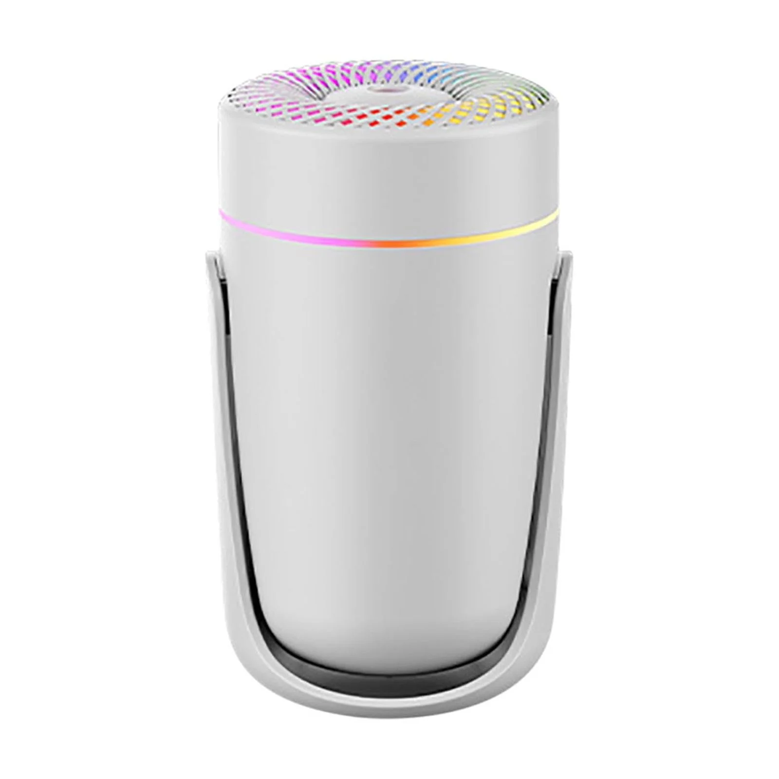 Mini humidificador portátil. Cuenta con base para mesa o superficies planas. Iluminación LED RGB. Capacidad: 200 ml. Recargable por medio de cable USB (incluido).