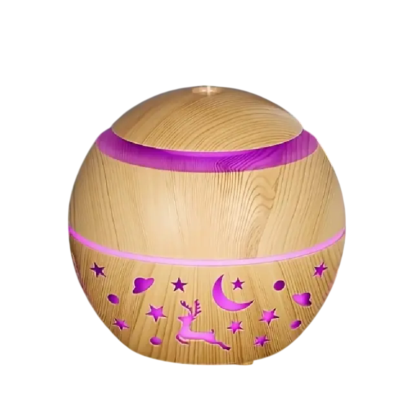 Humidificador purificador de ambientes. Diseño redondo para aromaterapia. Capacidad del tanque: 200 ml. Con difusor aromático. Cuenta con luz LED. Incluye cable USB para recargar.