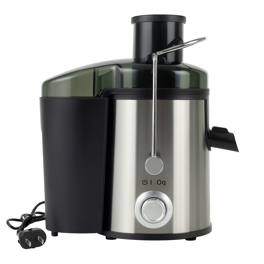 Extractor de jugos eléctrico de acero inoxidable con diseño compacto y elegante. Cuenta con un filtro de precisión, pico anti goteo y cerradura de doble seguridad. Su boca de 65 mm permite introducir frutas y verduras enteras