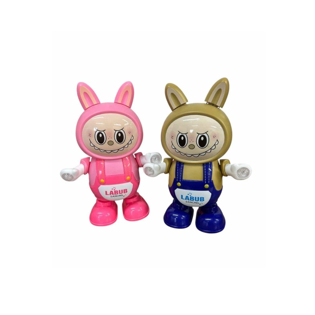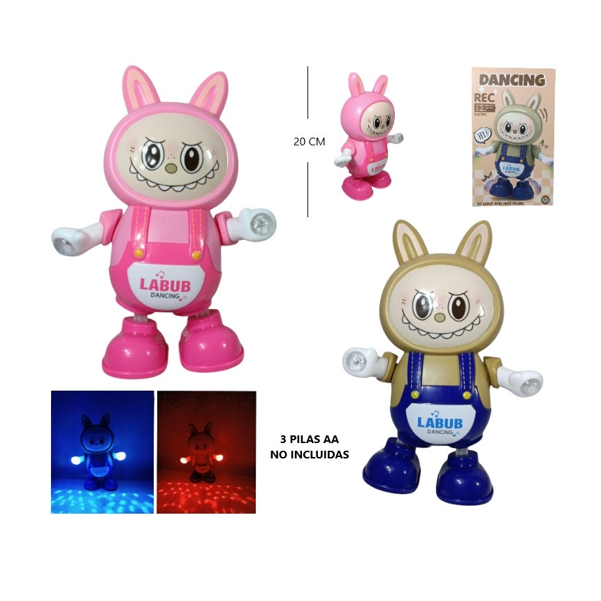 Juguete electrónico interactivo con luces de colores LED y sonido. Modelo Labubu que canta y baila. Funciona con 3 pilas AA (no incluidas).