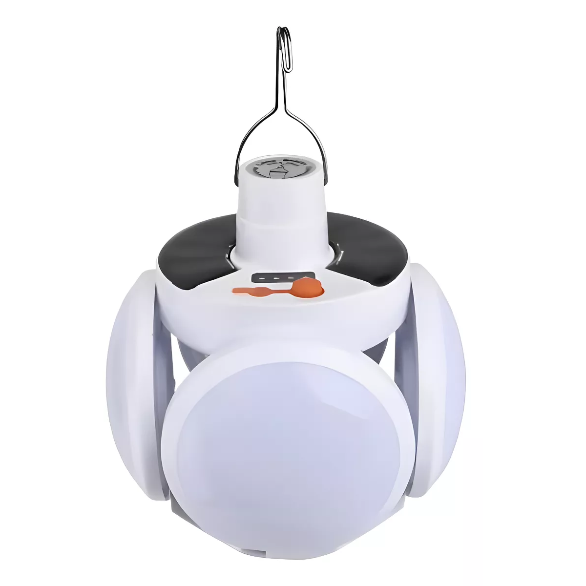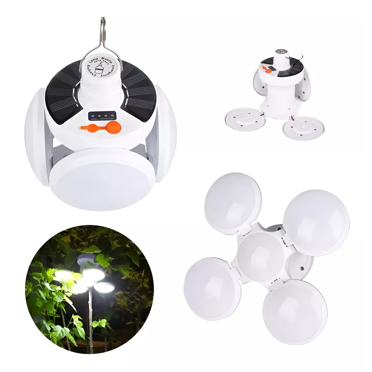 Luz LED blanca plegable para exteriores, con indicador de batería. Cinco modalidades de luz, carga solar y por USB.