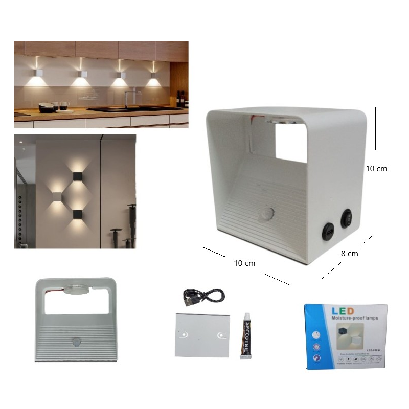 Lámpara de pared con iluminación LED tono cálido. Cuenta con sensor. Incluye kit de instalación y cable USB para recargar.
