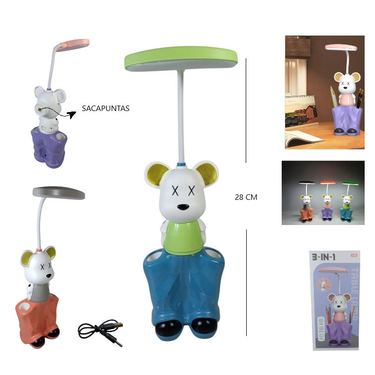 Lámpara con luz LED. Diseño infantil con portalápices y sacapuntas. Cuenta con brazo flexible. Recargable por medio de USB (cable incluido).