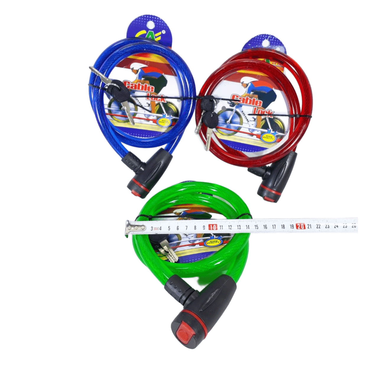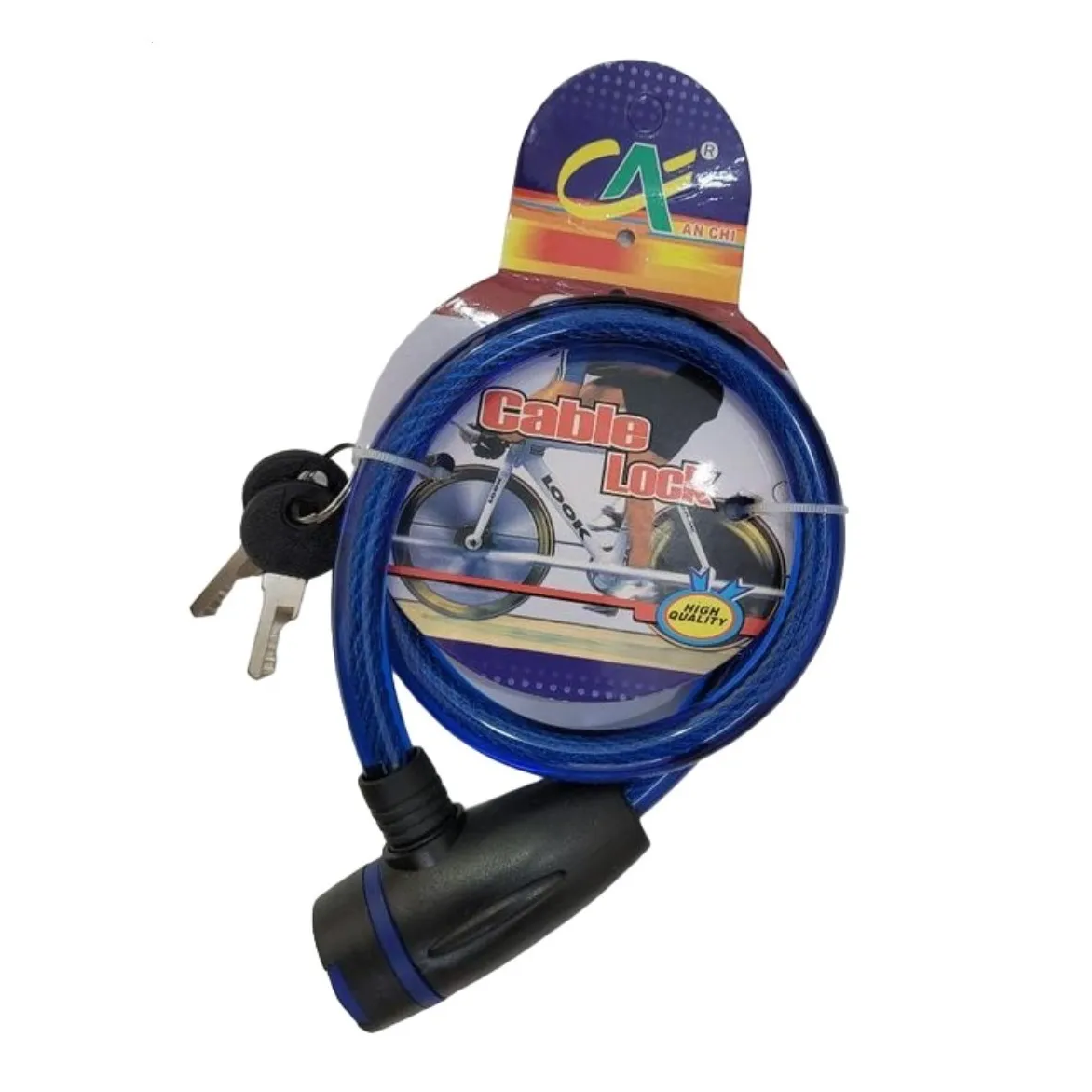 Candado tipo linga para bicicletas y motos. Con 1,8 mts. de longitud y 1,2 cm. de diámetro. Cerradura con protector y recubrimiento de PVC. Dos copias de llaves incluidas.