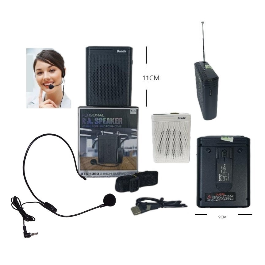 Parlante portátil 3" con bluetooth. Amplificador de voz. Incluye vincha con micrófono. Radio FM. Función grabadora. Cuenta con ranura para tarjeta micro SD y puerto USB. Potencia 5w. LED indicador de carga. Batería de litio 1200 mAh recargable por cable USB (incluido).