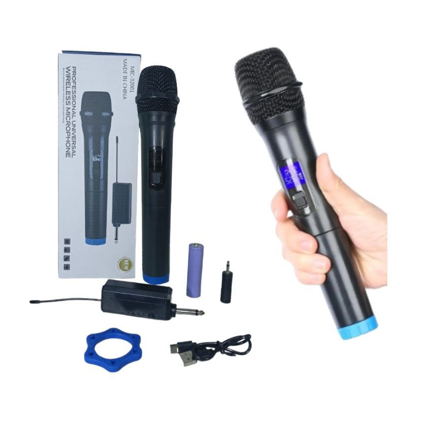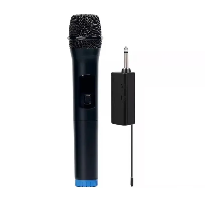 Micrófono inalámbrico dinámico con receptor. Cuenta con un alcance de hasta 50 metros. Funciona con pilas AA. Opción de recarga por medio de USB tipo C.