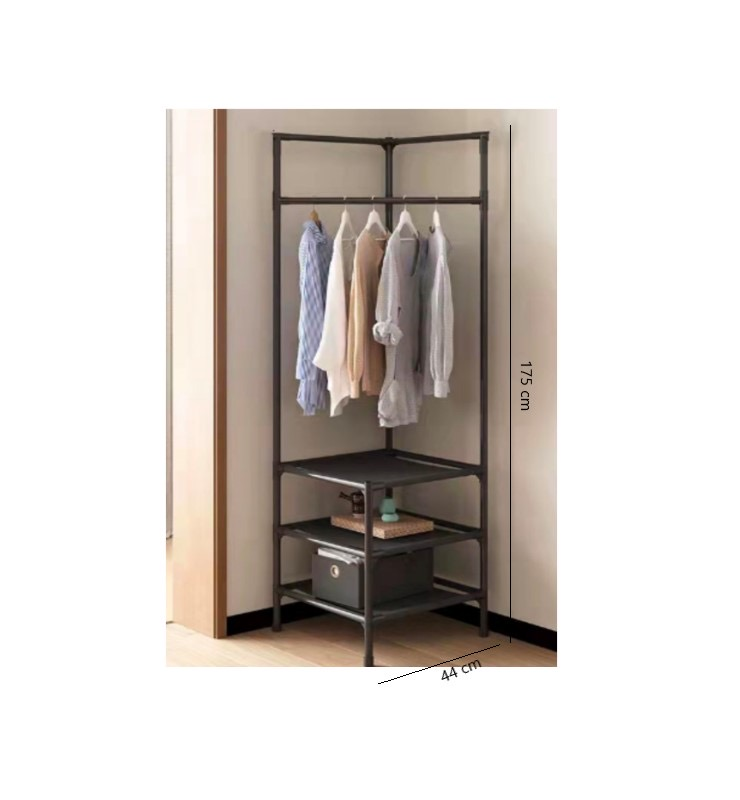 Esquinero metálico con lugar de almacenamiento y perchero integrado. Fácil armado.