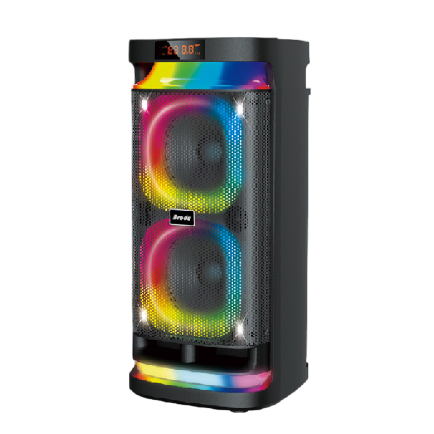 Altavoz bluetooth karaoke de 16″ con 2 micrófonos inalámbricos. Iluminación LED RGB. Conector auxiliar de 3,5 mm. Orificio de micrófono de 6,5 mm. Batería incorporada 3000mAh. Respuesta de frecuencia: 100 Hz - 20 KHz. Características: TF/TWS/disco U. Cuenta con entrada de guitarra. Conector tipo C.