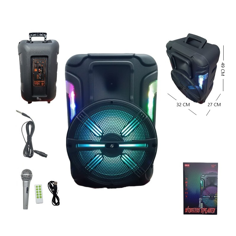 Parlante de 12 pulgadas. Conexión bluetooth. Radio FM. Luces LED RGB. Frecuencia: 100Hz – 20KHz. Rango de la frecuencia FM: 87.5 – 108.0MHz. Memoria USB/TF. Cuenta con batería recargable por medio de cable USB (incluido). Trae micrófono alámbrico, cable auxiliar, control y manual de instrucciones.