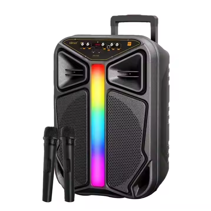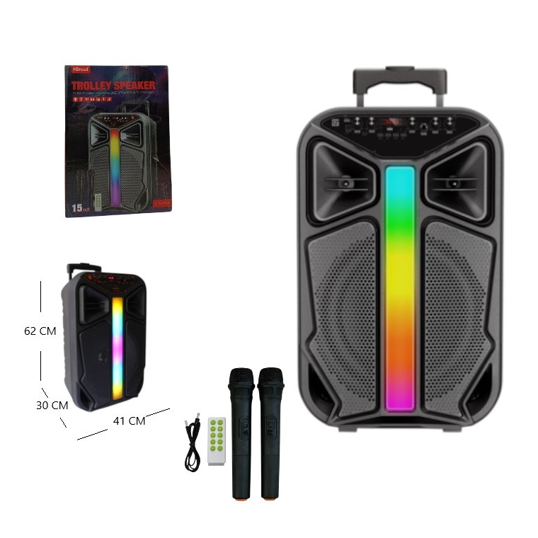 Parlante bluetooth de 15 pulgadas. Luces LED RGB. Radio FM. Conectividad: TWS/USB/SD/AUX. Pantalla digital. Diseño portátil. Cuenta con batería recargable. Incluye 2 micrófonos para karaoke.