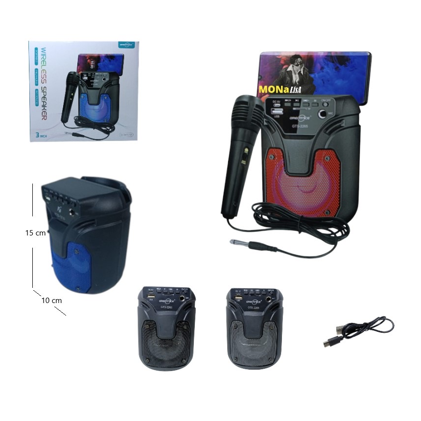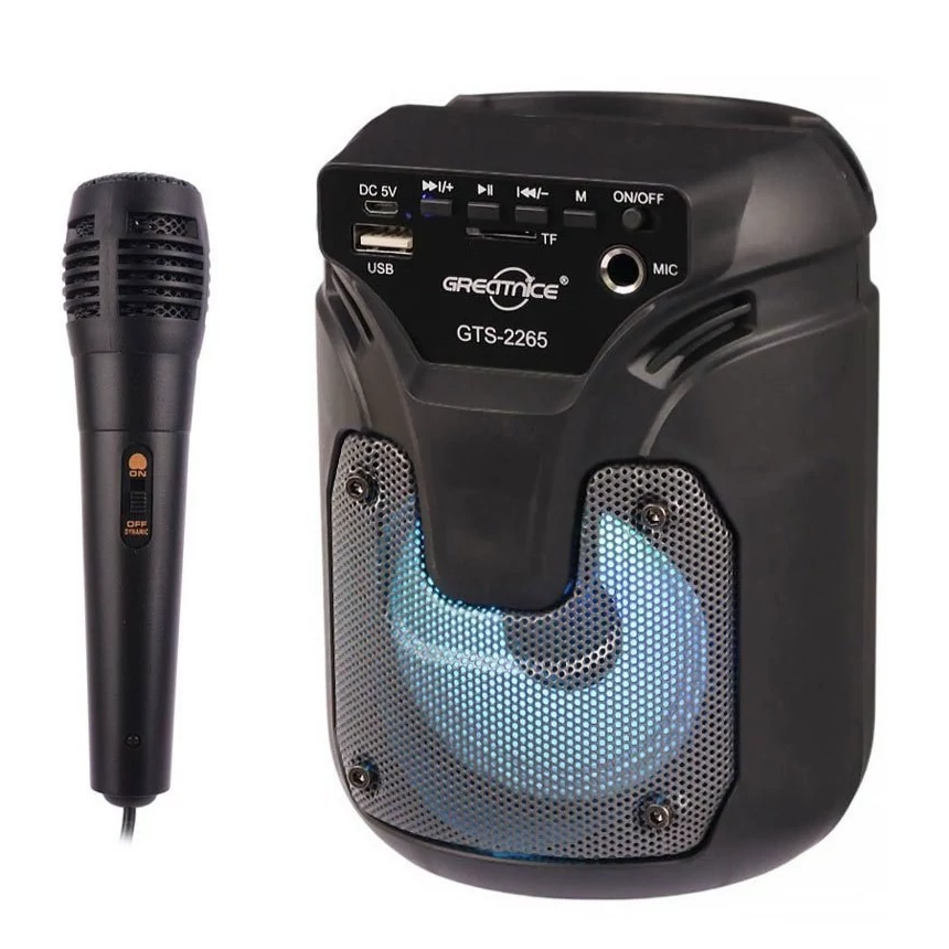 Parlante bluetooth portátil inalámbrico con micrófono. Potencia de salida 5w. Cuenta con luces LED RGB. Función FM y MP3. Batería recargable por cable USB (incluido).