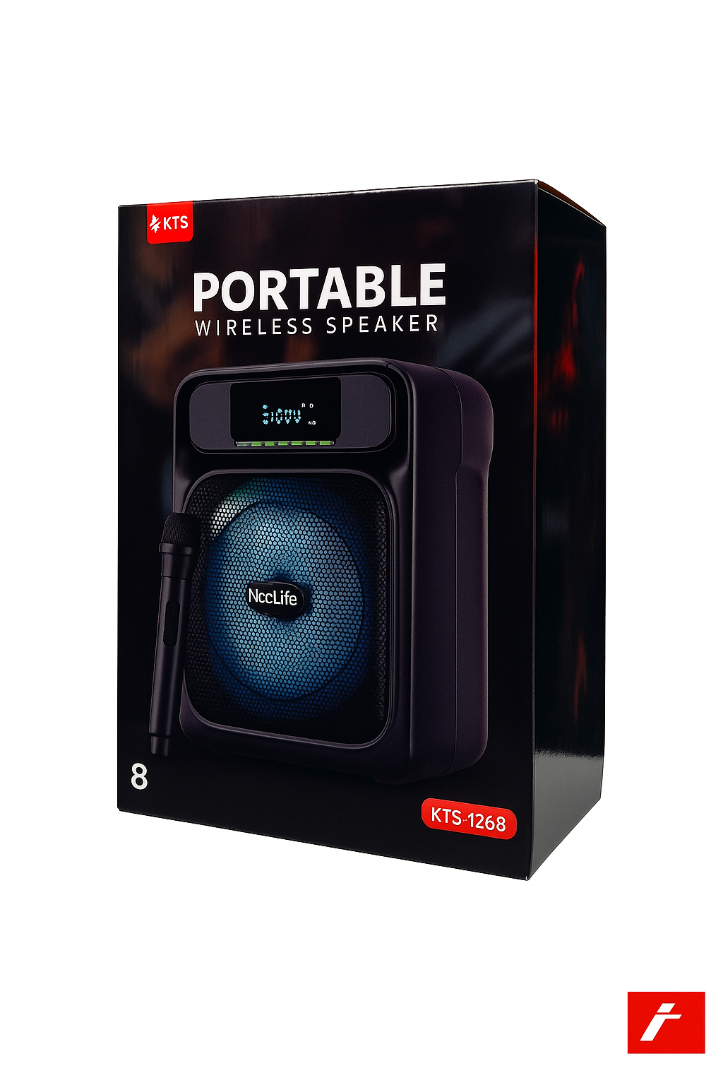 Parlante Portátil Bluetooth KTS-2168 de 8 pulgadas con sonido potente. Incluye soporte para micrófono, Bluetooth, múltiples entradas (USB, TF, AUX, FM) y batería recargable. Diseño compacto y fácil de transportar