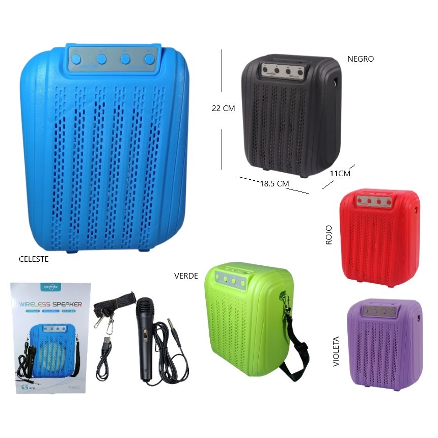 Parlante bluetooth de 6,5" con correa para transportar. Luces LED. Radio FM. Cuenta con controles de audio, ranuras para USB y micro SD. Trae cable USB tipo C para recargar. Incluye micrófono alámbrico. En varios colores.