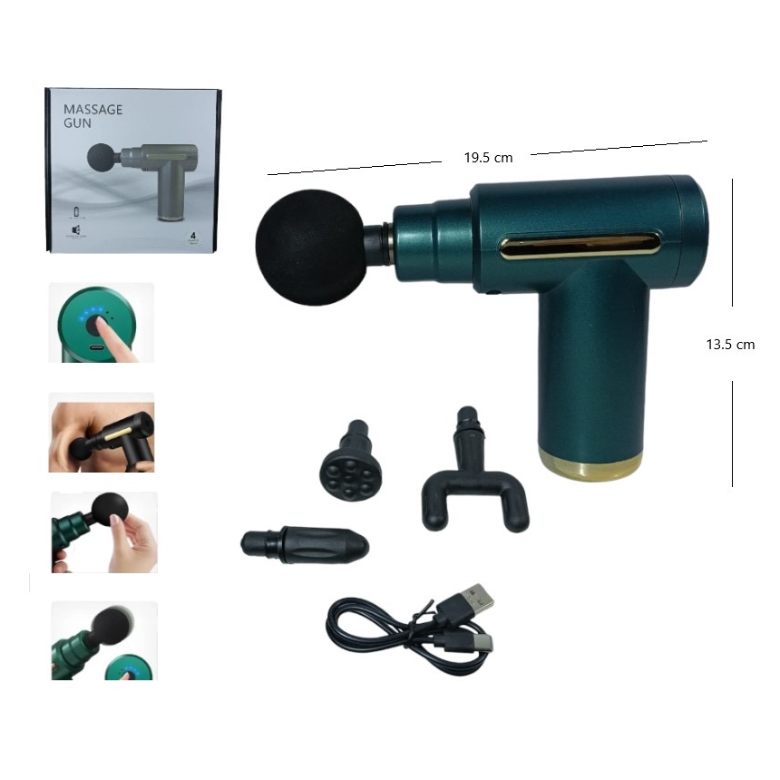 Pistola masajeador portátil con 4 cabezales intercambiables; cabezal redondo, bullet, plano, y horquilla. Cuenta con 6 velocidades. Capacidad de la batería 1800mAh. Incluye indicador de carga. Recargable por medio de USB.