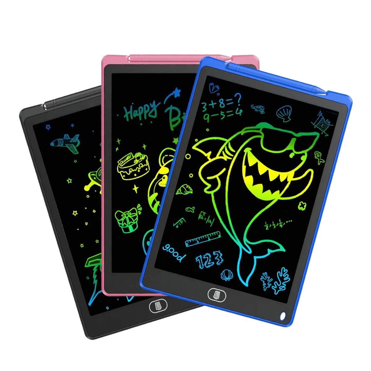 Pizarra portátil con pantalla de 12 pulgadas. Cuenta con trazo multicolor. Incluye lápiz y botón de borrado. En varios colores.