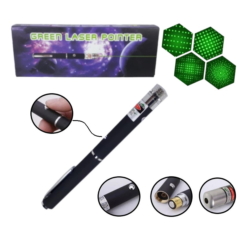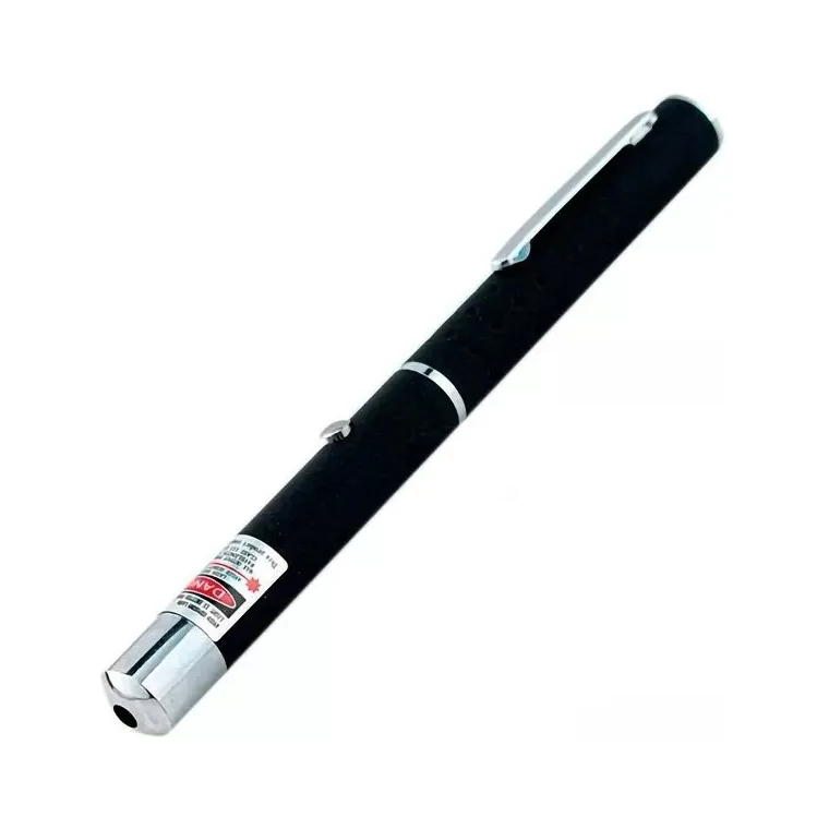 Puntero láser tipo lápiz. Luz del láser color verde. Cuenta con botón de encendido y apagado. Funciona con baterías estándar AAA.