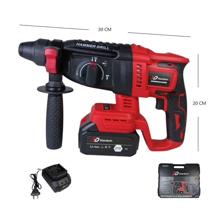 Rotomartillo inalámbrico Stardom 900w. Frecuencia: 50 60hz. Permite taladrar sin percusión. Ejecuta 4700 golpes por minuto. Tope de profundidad para perforaciones precisas. Diámetro de perforación de 26 mm. 2 baterías 21v. Mango ergonómico. Incluye cargador.
