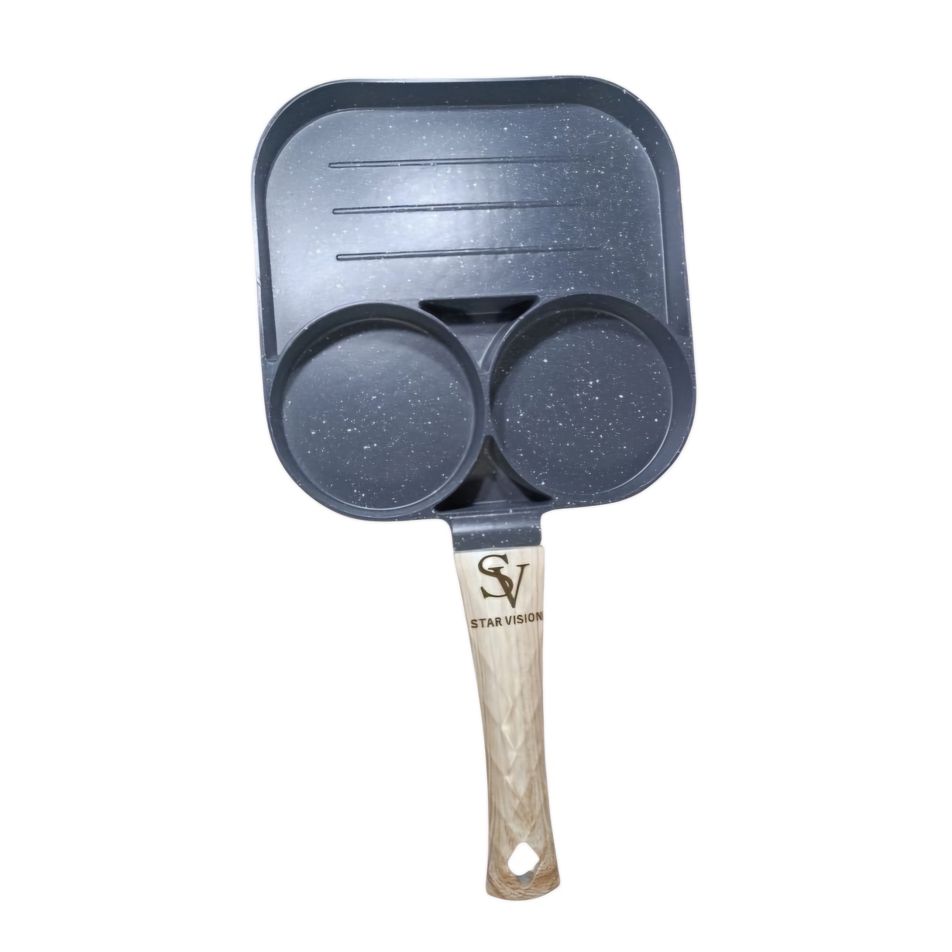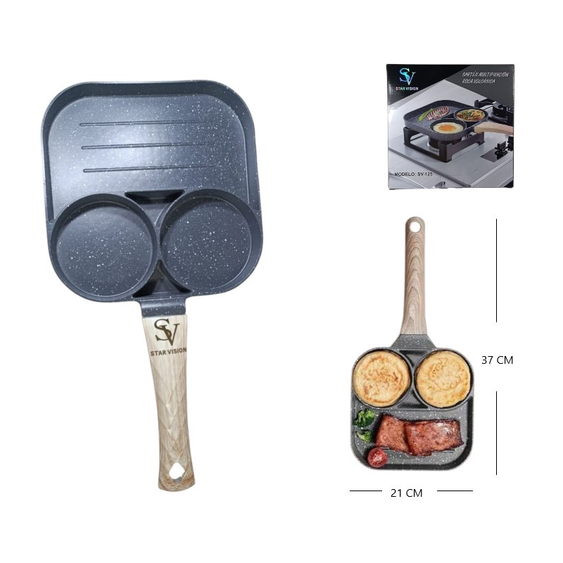 Sartén con superficie antiadherente 3 en 1. Cuerpo fabricado con textura de roca volcánica. Cuenta con mango de madera.
