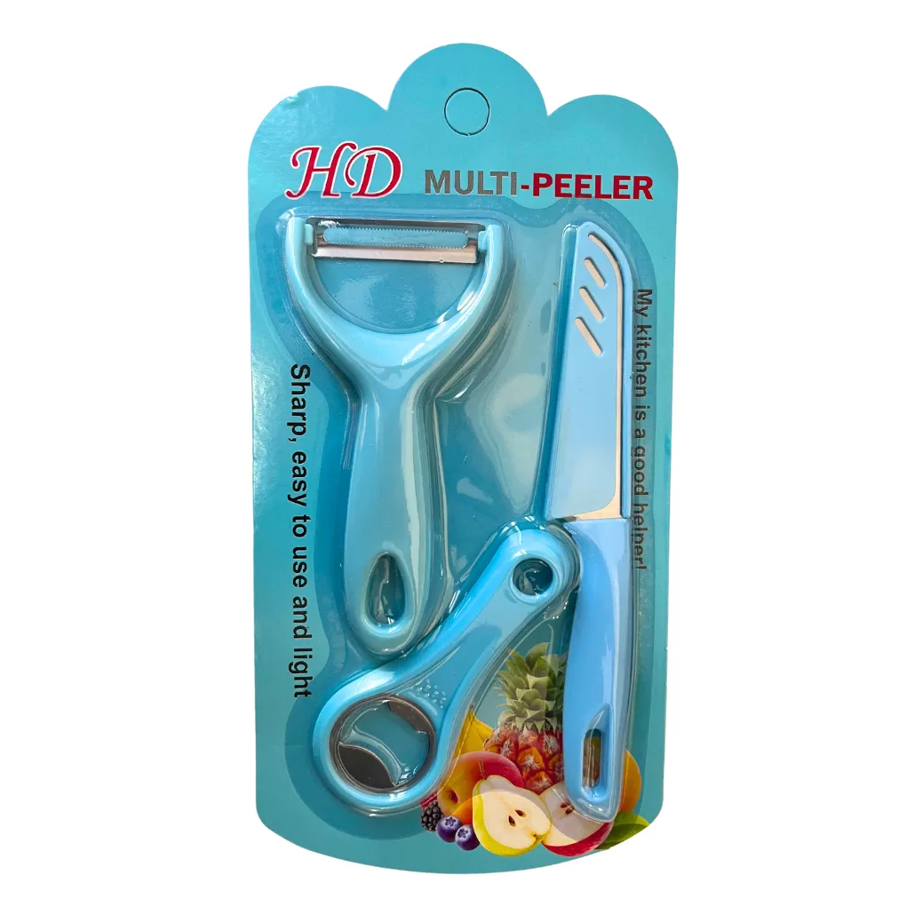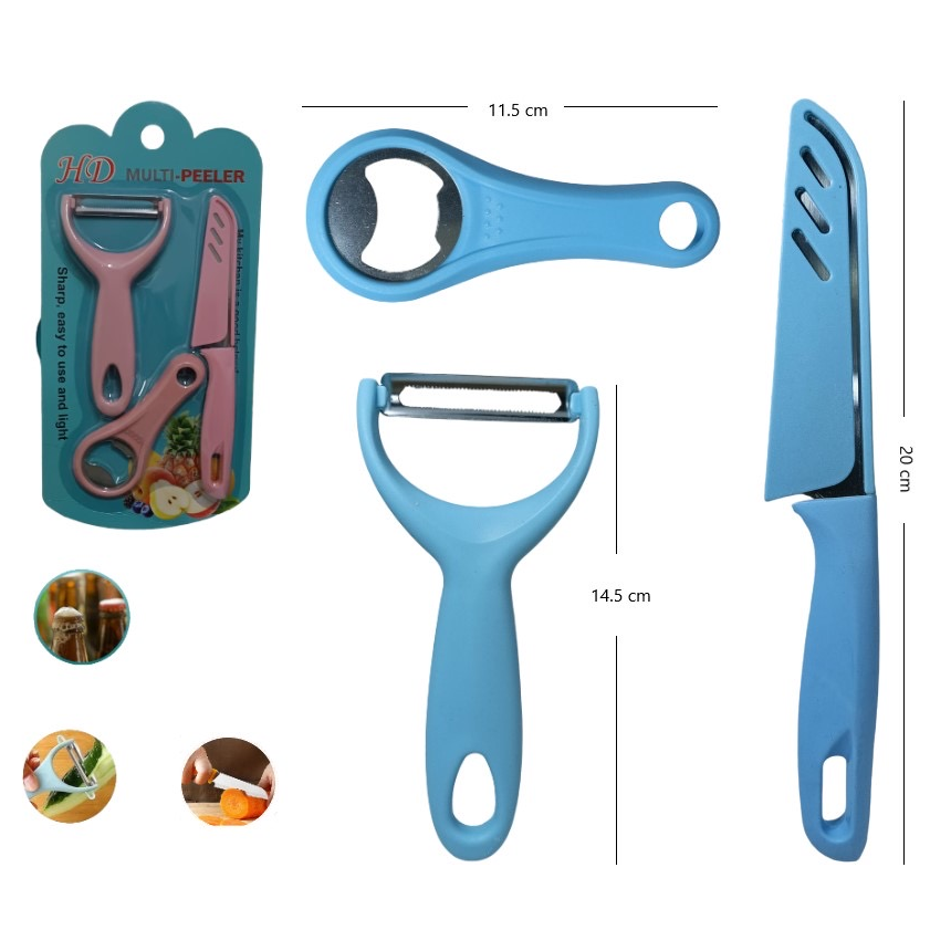 Set que incluye pela papa, destapador de botellas y un cuchillo con hoja de acero inoxidable (incluye protector).