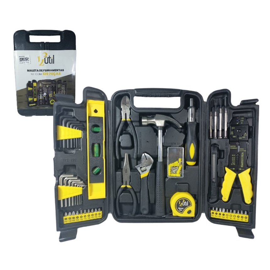 Caja de herramientas de 129 piezas. Contiene 64 clavos (20mm), 6 tornillos (3x25 mm) M5, 6 piezas de expansión de plástico M6, 8 llaves hexagonales negras, 8 llaves hexagonales cromadas, 20 puntas de destornillador, 1 nivel de 9", 4 destornilladores de precisión, 1 alicate de punta fina de 6", 1 alicate de corte diagonal de 6", 1 llave ajustable de 6", 1 martillo de cabeza de carnero de 8", 1 cinta métrica de 3 mts, 1 cuchillo multiusos y 1 alicate pelacables de 8"