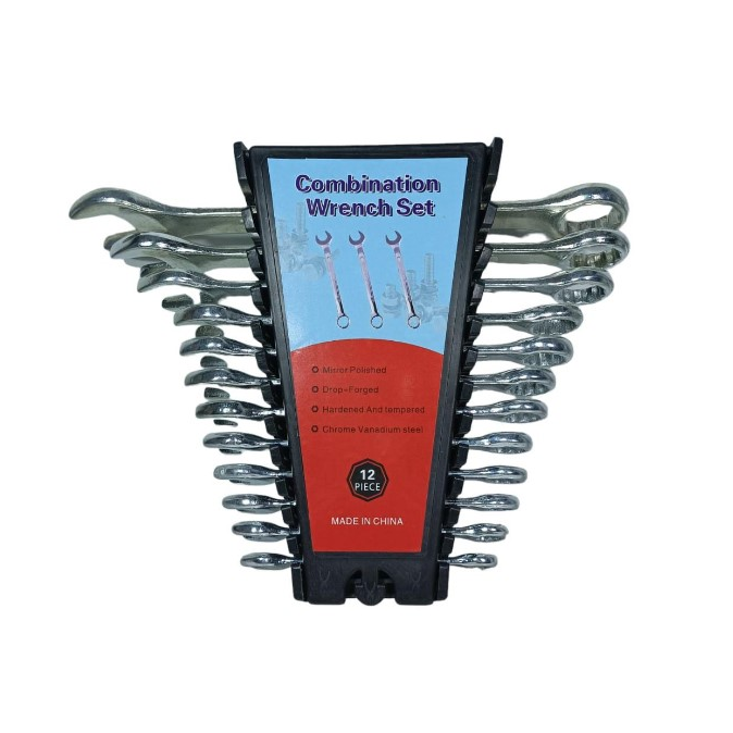 El set incluye 12 piezas de llaves combinadas con medidas que van desde 8 mm hasta 22 mm. Fabricadas en acero cromo vanadio. Incluye estuche plástico para guardado organizado.