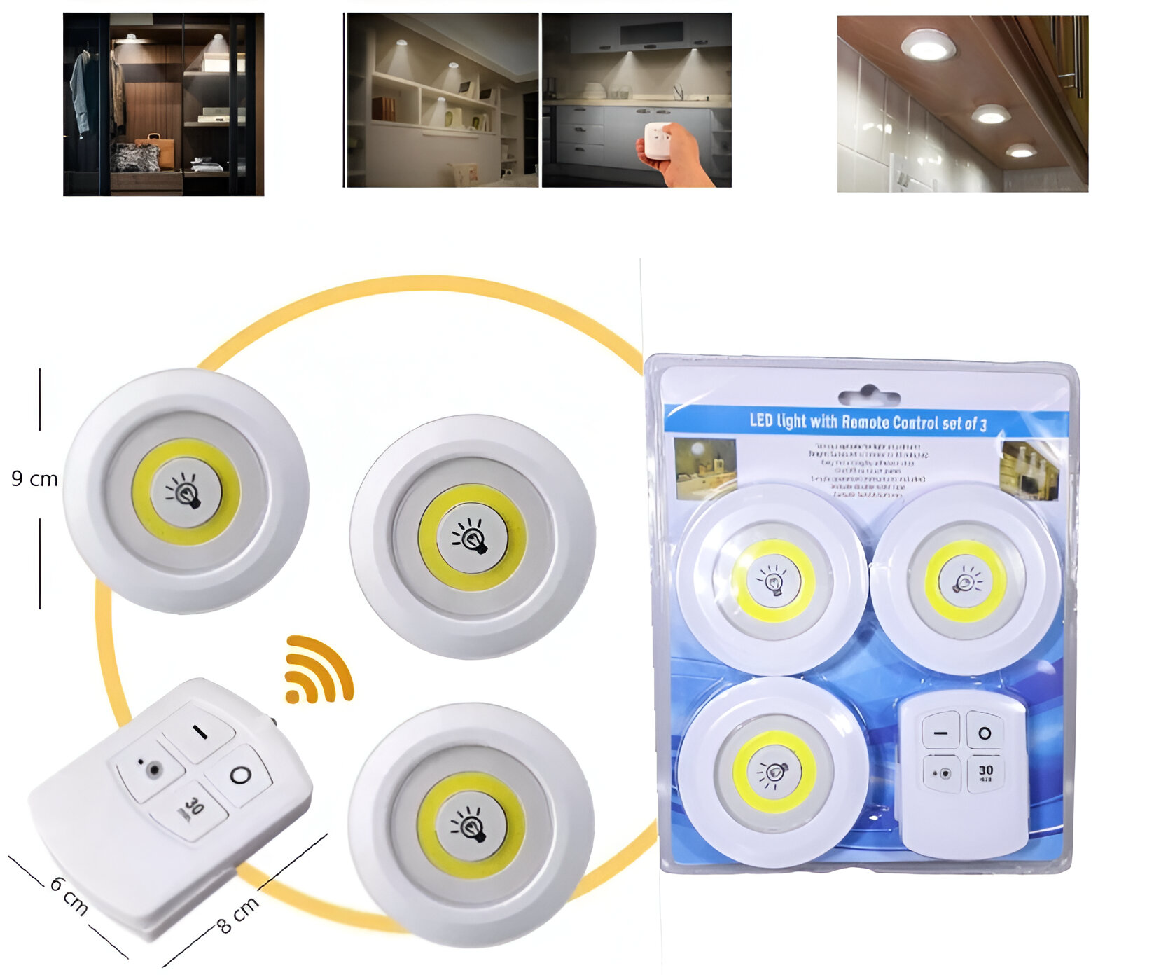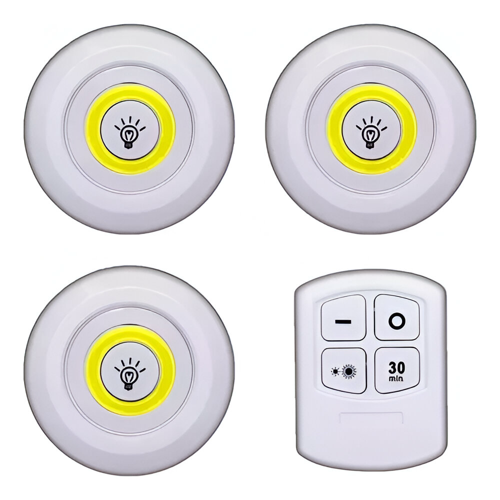 Set de 3 luces ofrece una luz intensa, y con la cual podes iluminar cualquier espacio donde sea difícil hacer conexiones eléctricas, o bien usarlas como luces de emergencia. Viene con un control remoto para ajustar el brillo y con la función de temporizador automático de 30 minutos de apagado.