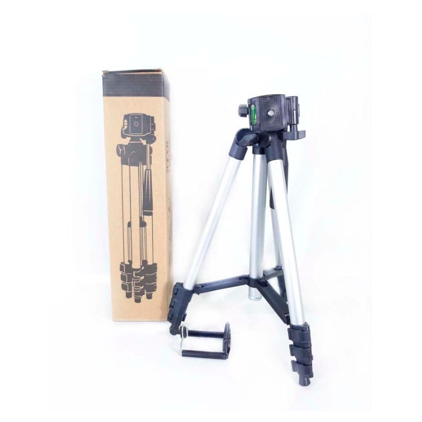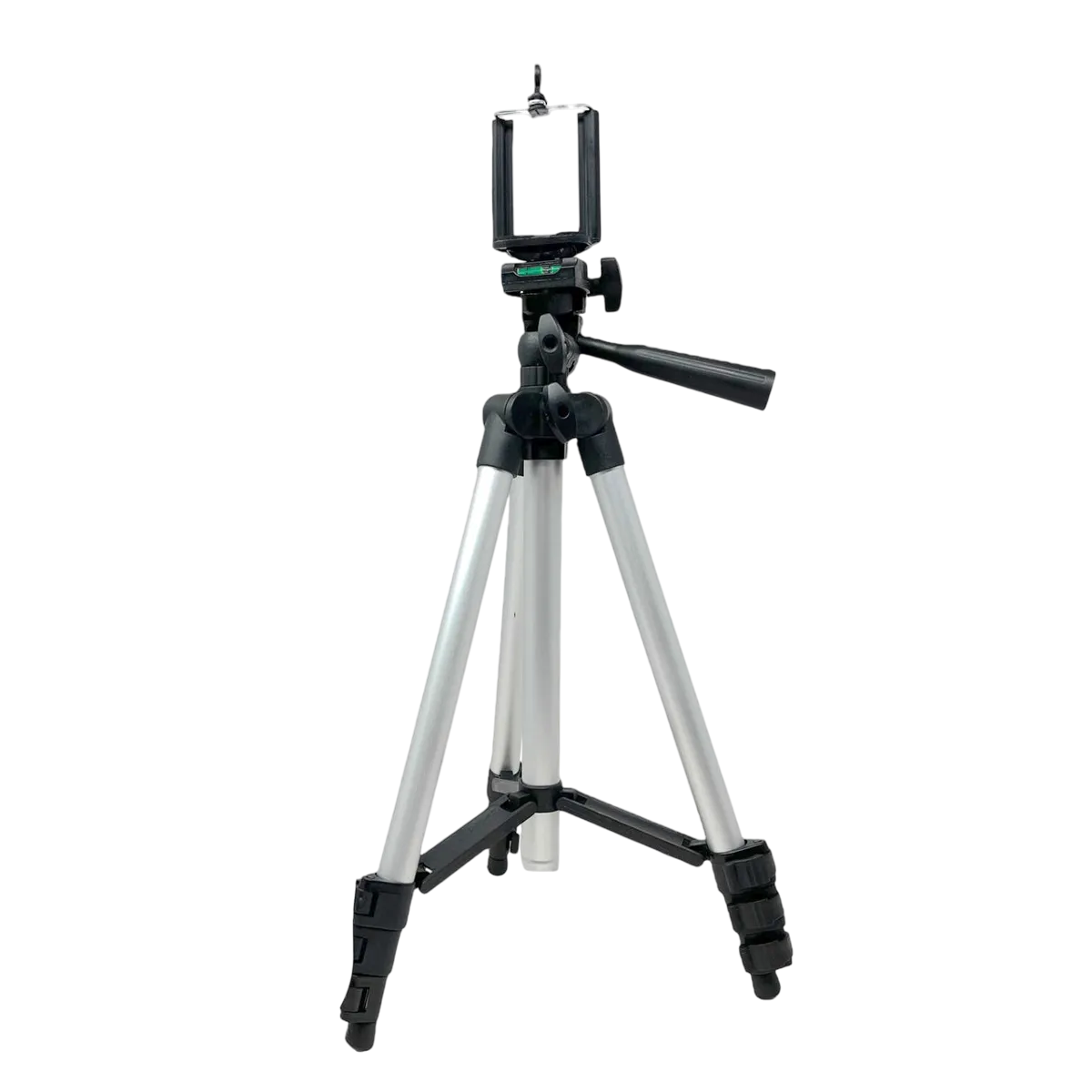 Trípode de aluminio con patas telescópicas. Incluye palanca de bloqueo, cabezal con 3 direcciones e indicador de nivel integrado. Configurable con agarre para celular o tornillo de 1/4 para cámaras. Cada pata cuenta con tres frenos independientes para regular la altura.