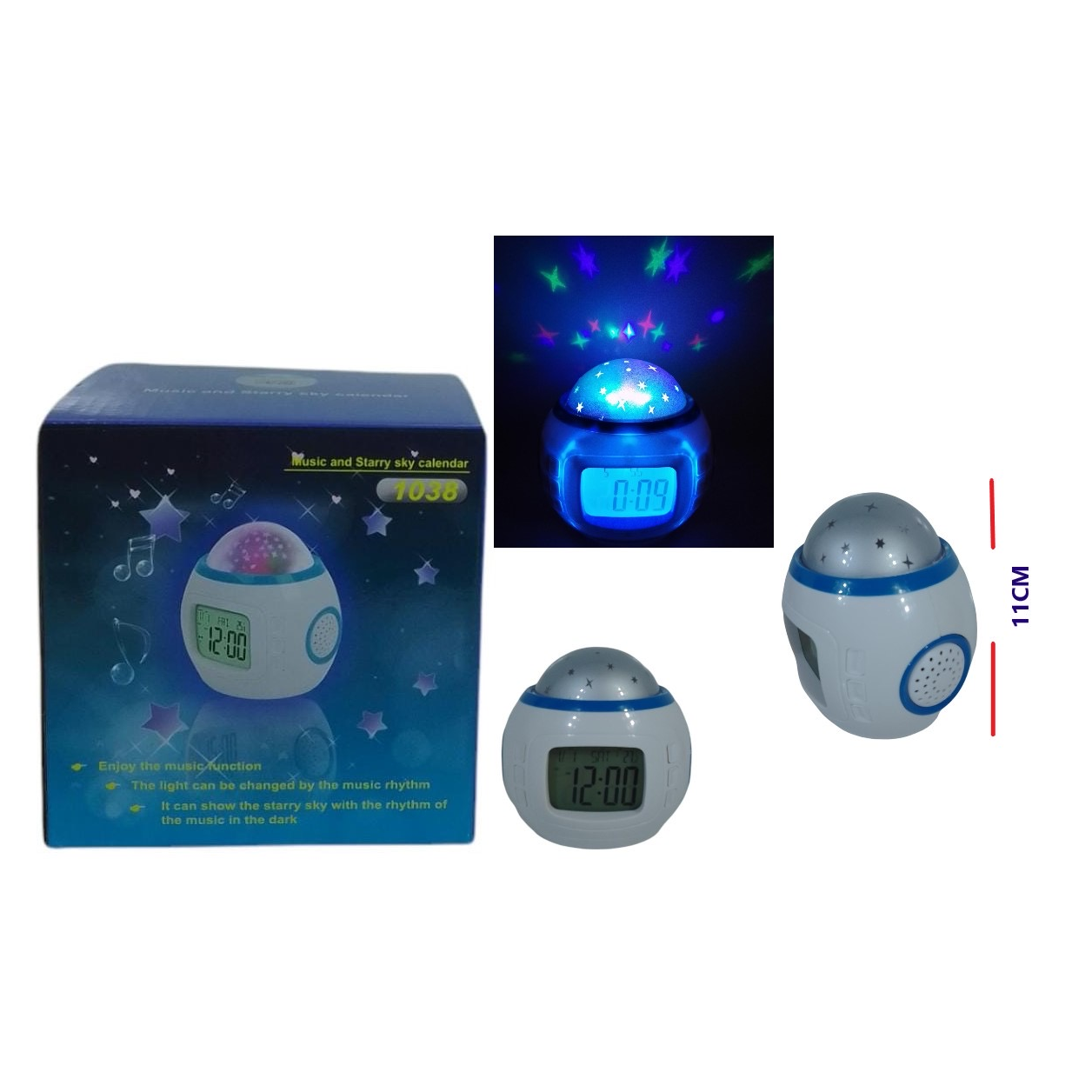Reloj proyector de estrellas con música y alarma. Funciona con tres pilas AAA. Visualiza hora, temperatura y fecha.