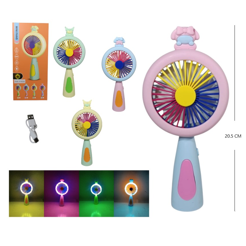 Ventilador portátil con luz LED RGB. Cargador cable USB incluido. Varios diseños y colores.
